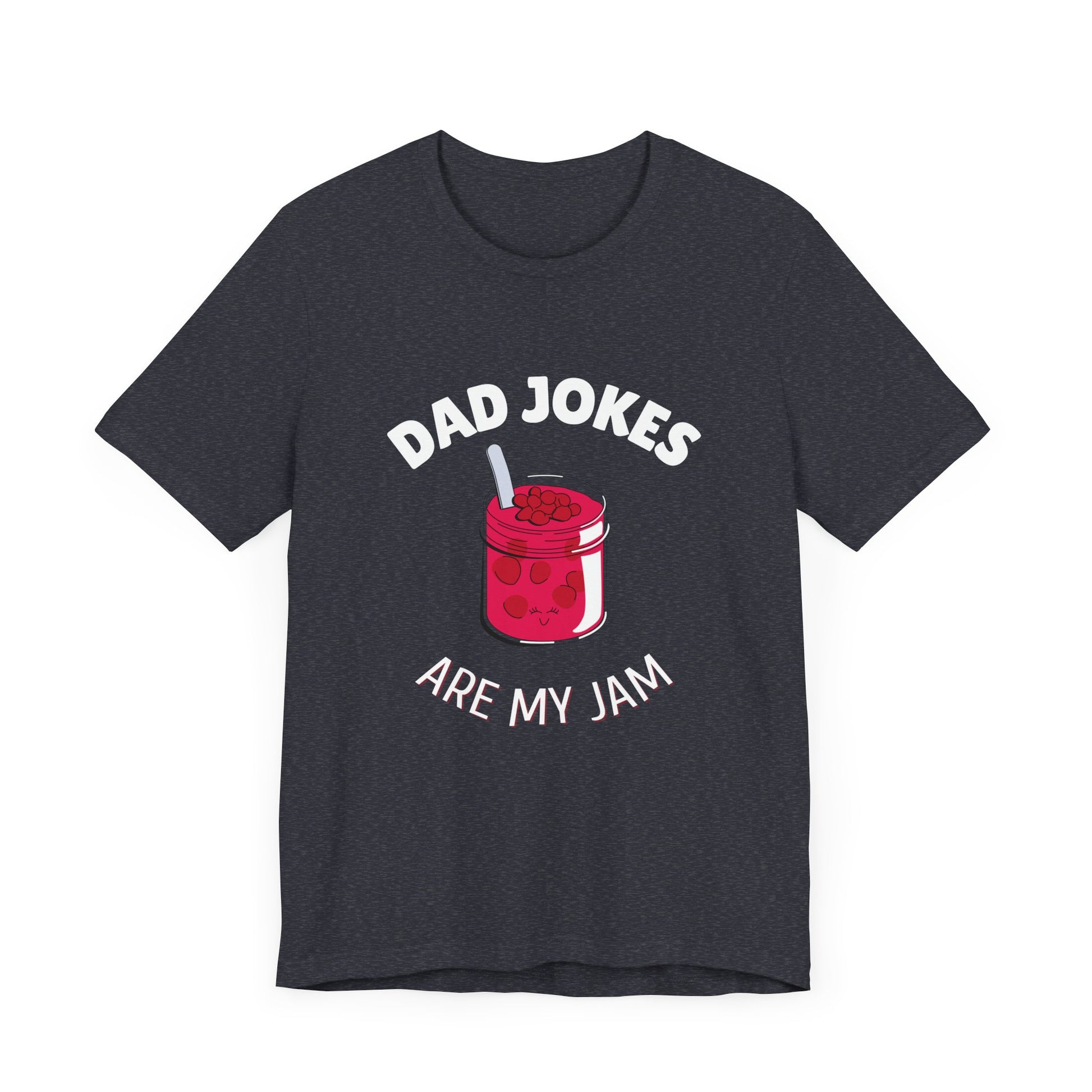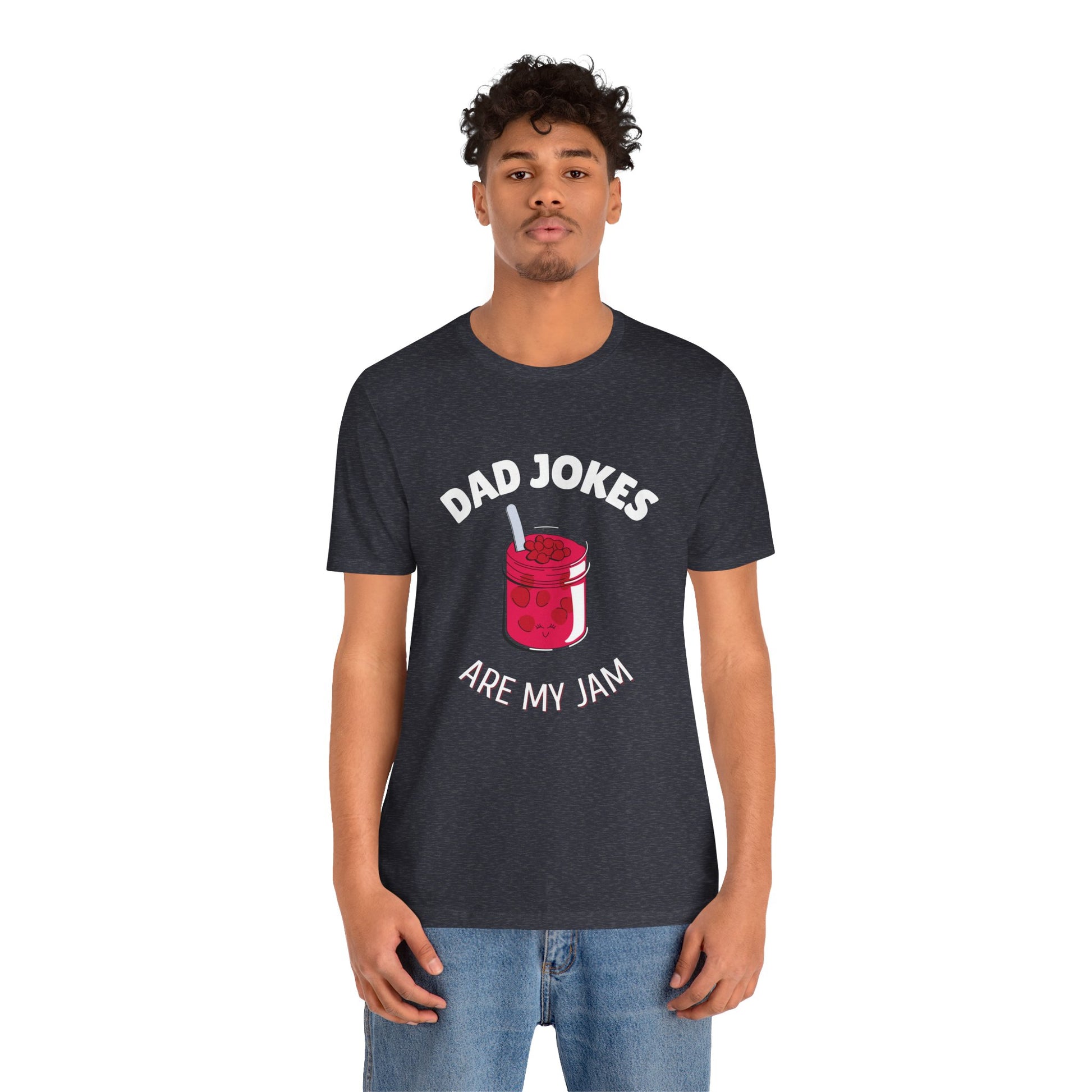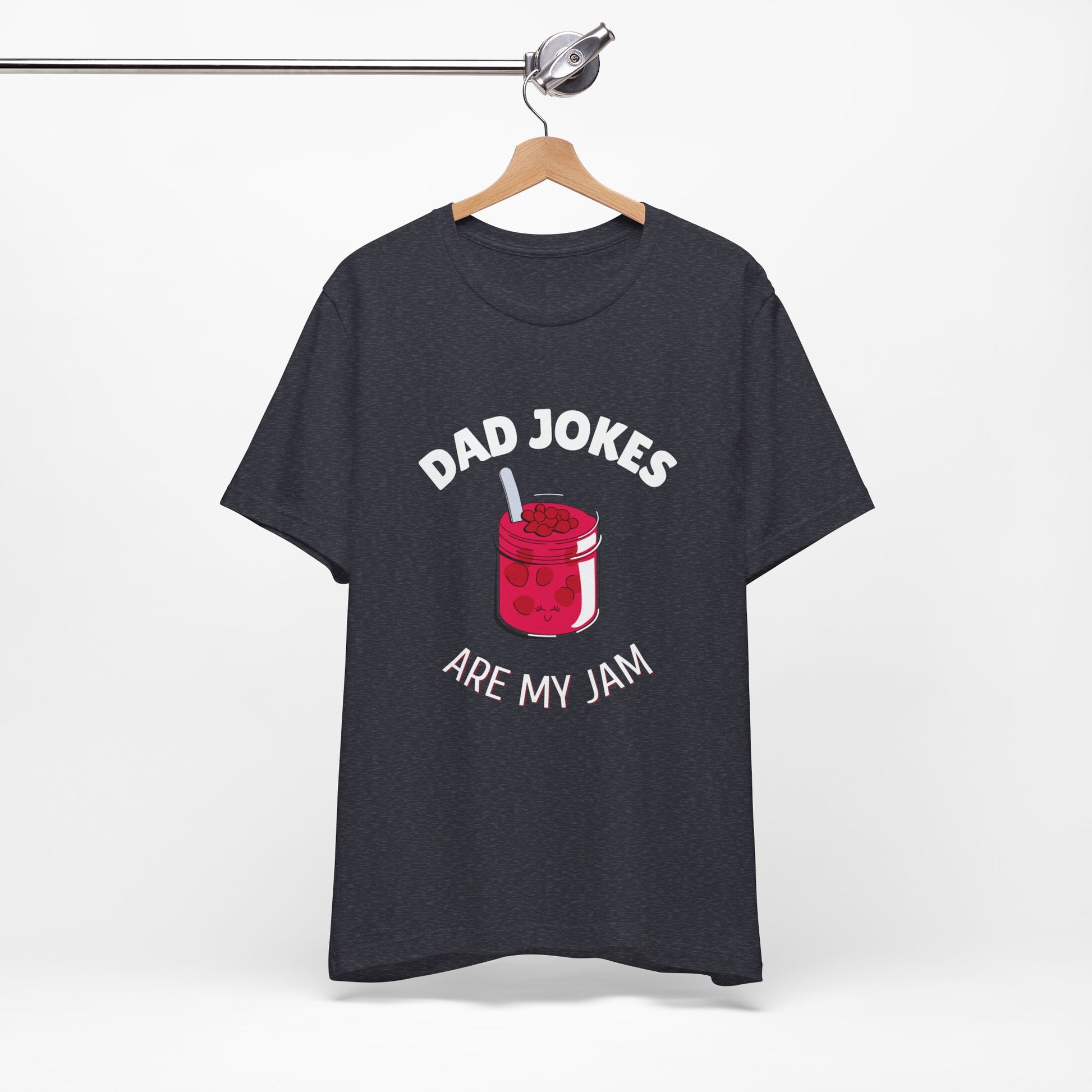 .: Fun graphic tee with a playful "Dad Jokes Are My Jam" design.