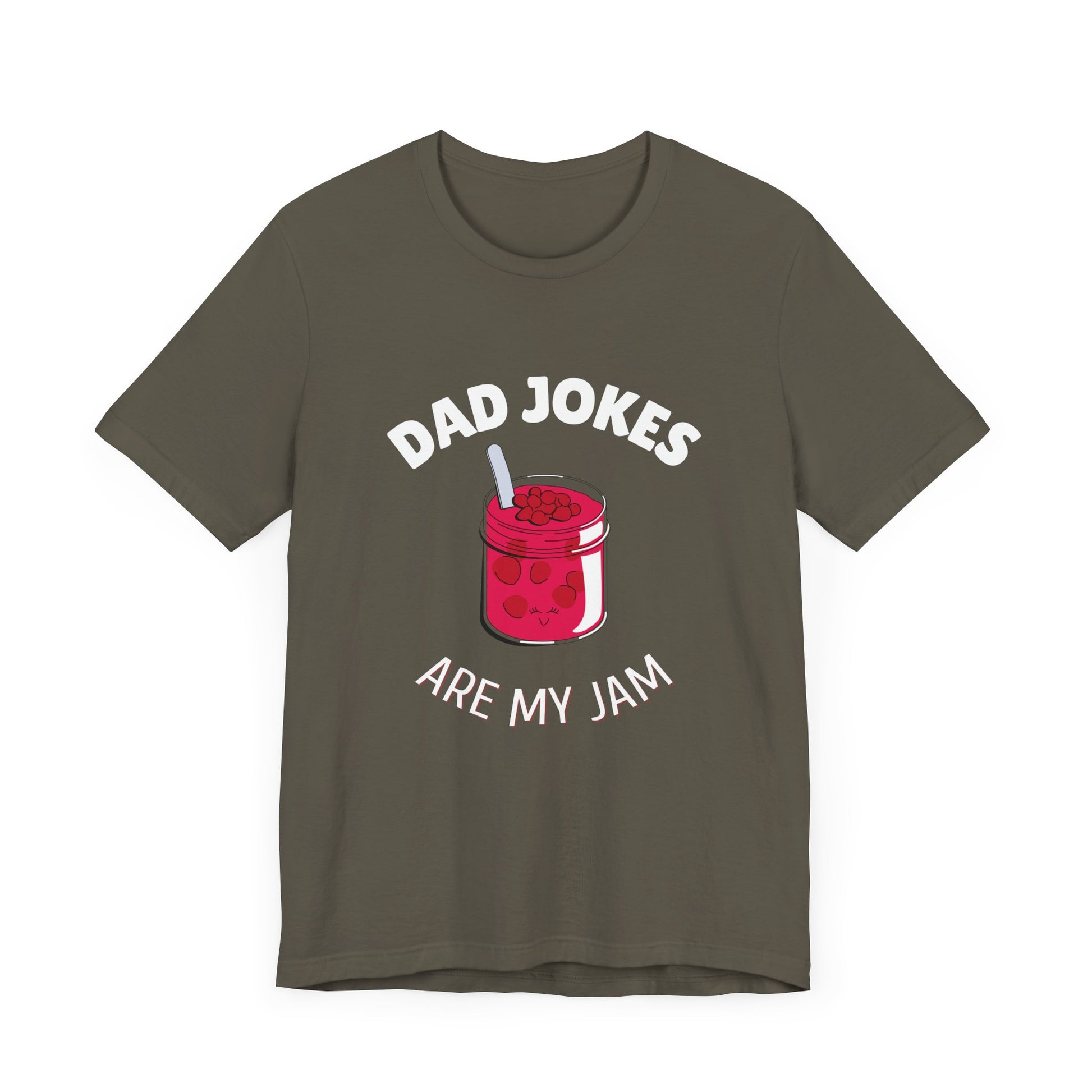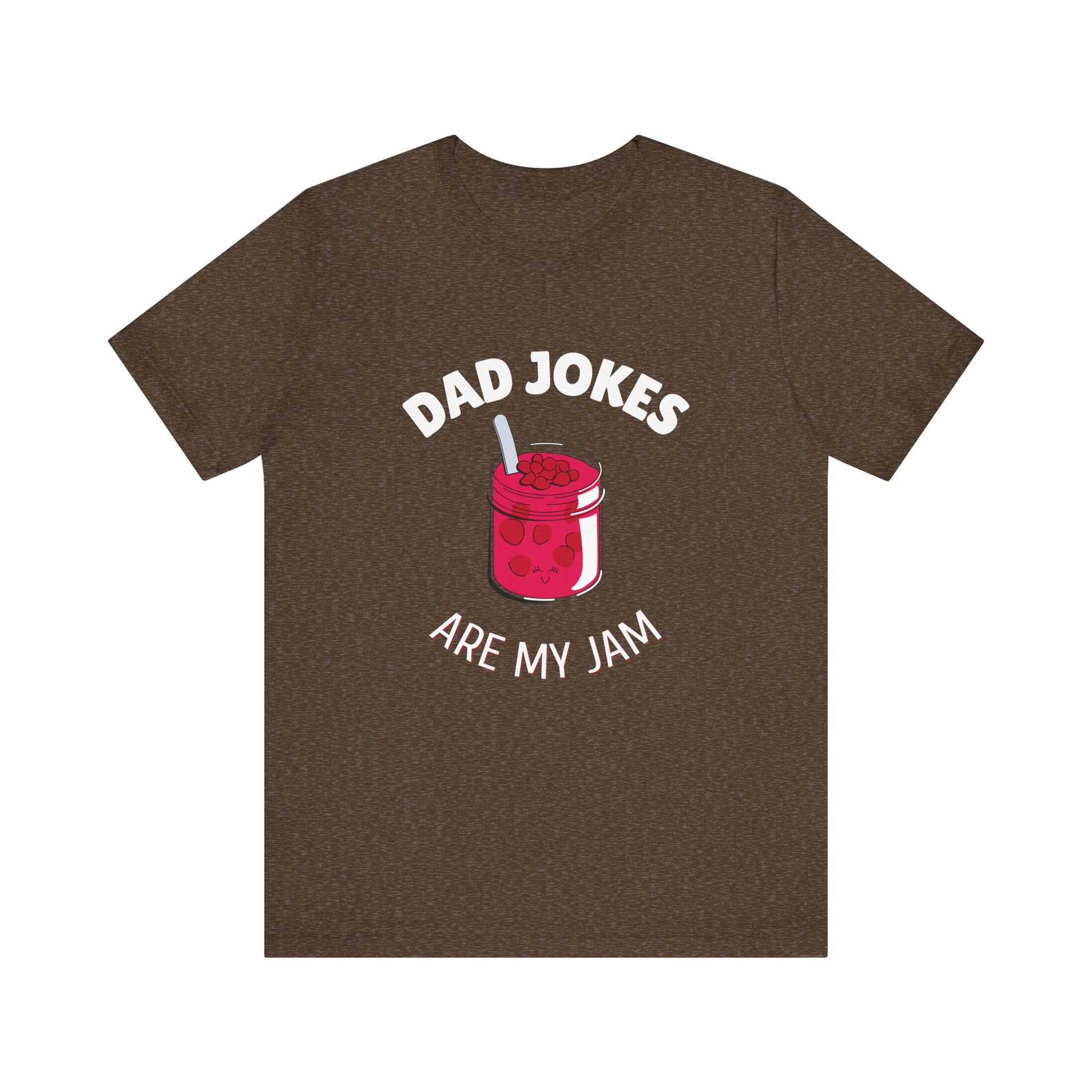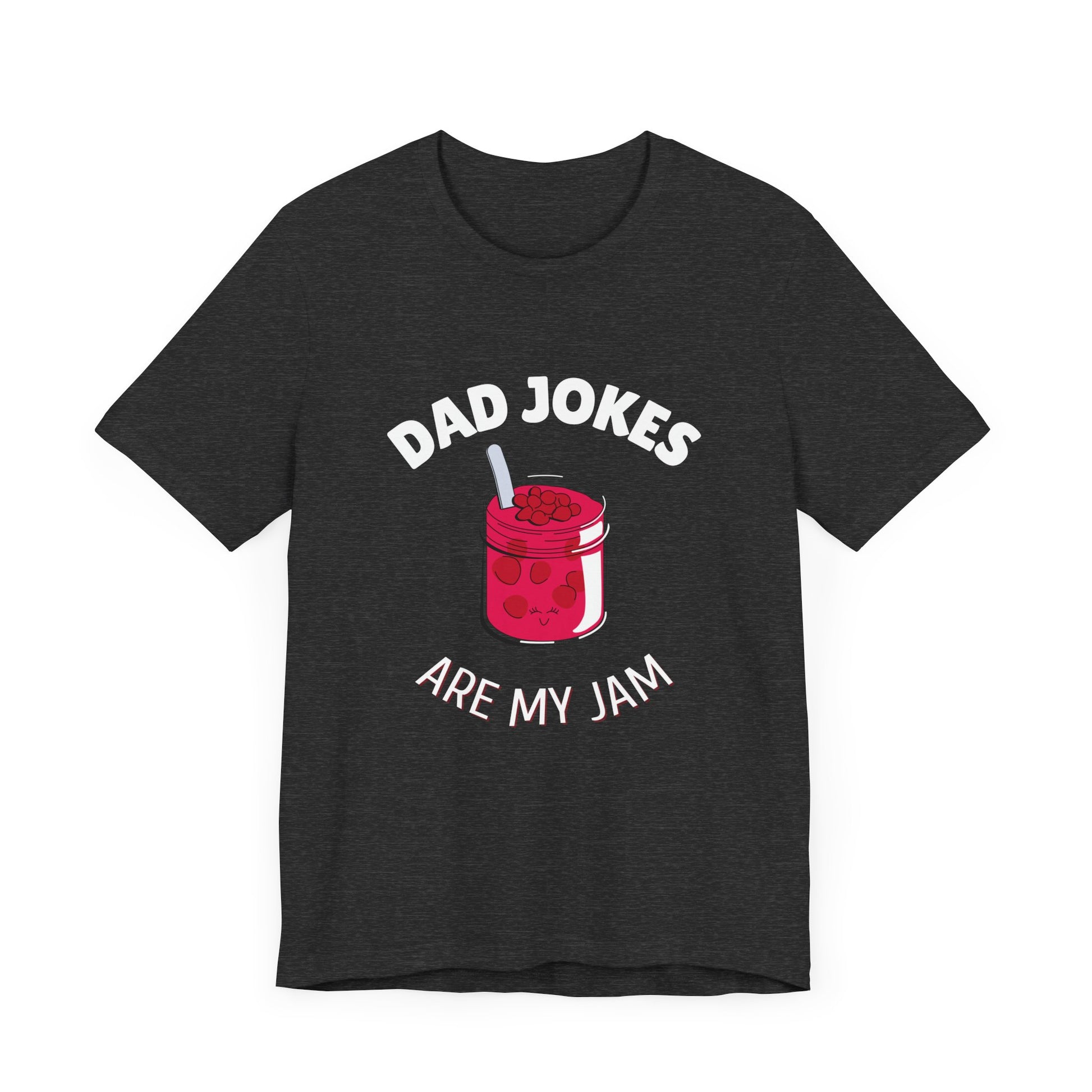 .: Fun graphic tee with a playful "Dad Jokes Are My Jam" design.